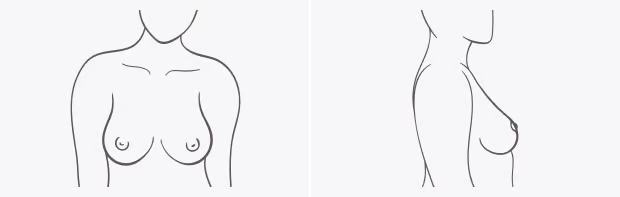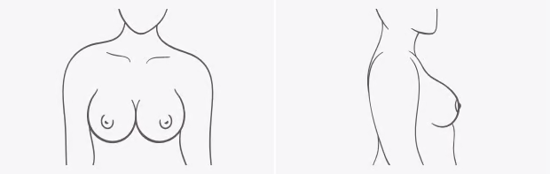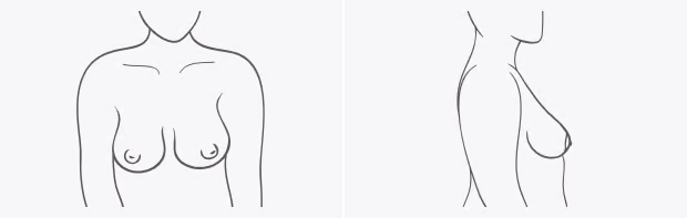 The tissue for this shape is dense and close-set to the body. If you're Low Profile, your breasts likely have less fullness. While it can vary, typically, your nipples will point forward.